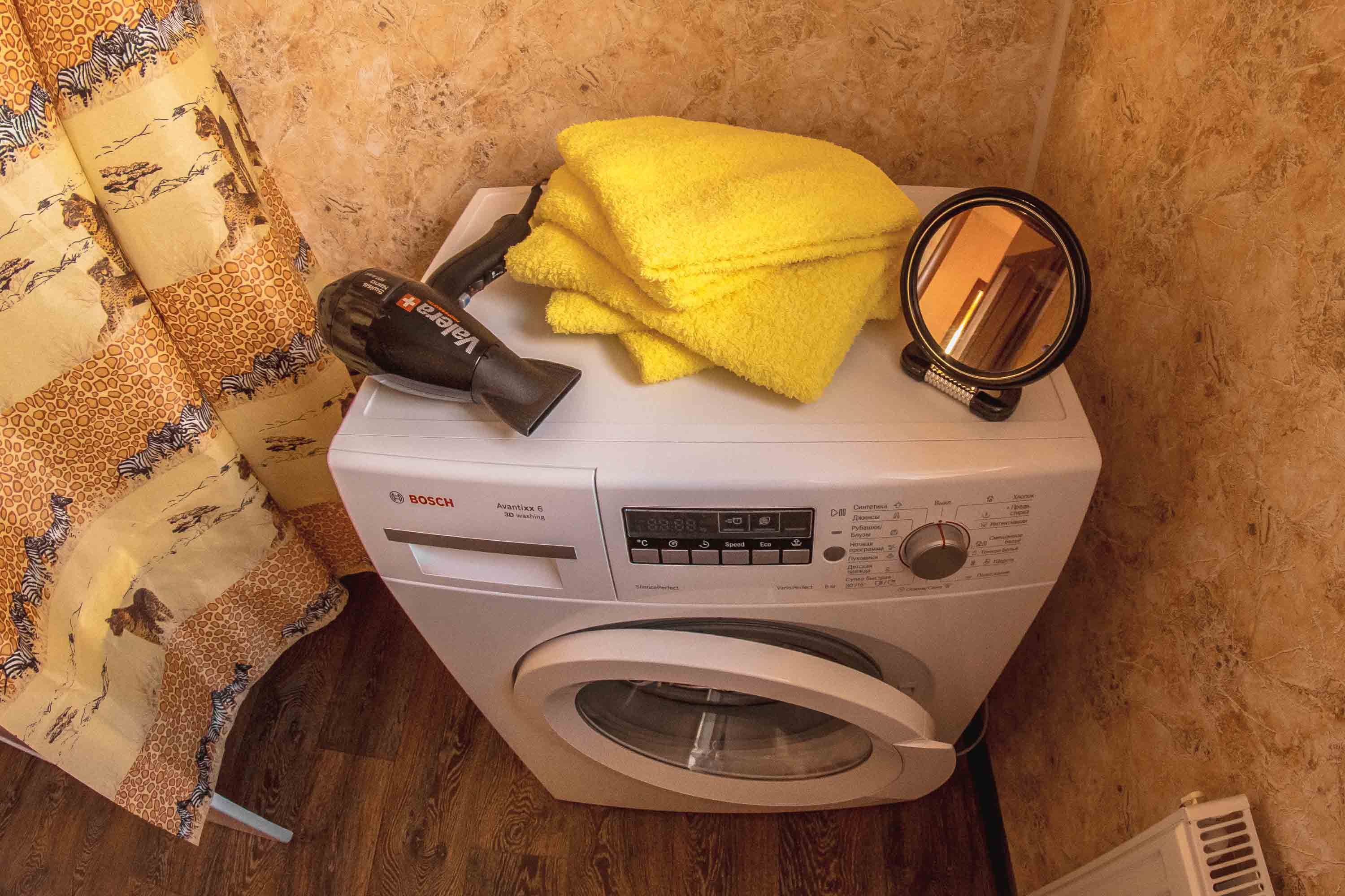 • в ванной: горячий душ без перебоев, стиральная машина, фен, полотенце.