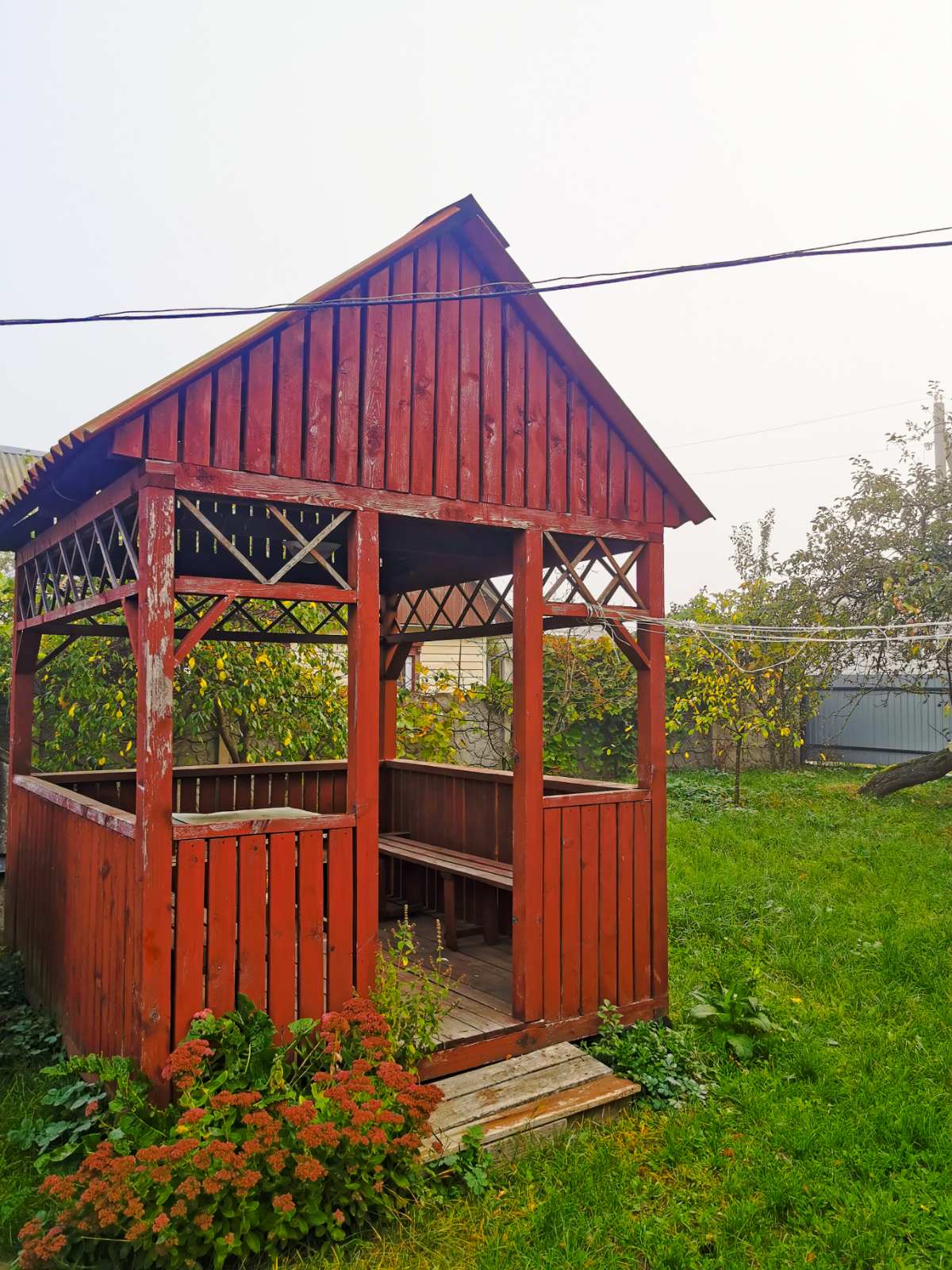 Участок высокий и ровный, без перепадов рельефа, площадь 6,65 соток, каменные дорожки, подъезд и стоянка машин, плодовые деревья, цветы, беседка, кирпичный гараж (51 м2, на 2 входа, смотровая яма, кладовка, сарай), отдельный погреб (всегда 3 градуса), есть колодец. Прекрасные интеллигентные соседи только с 2 сторон, новый высокий забор из металлопрофиля/бетона по всему периметру.