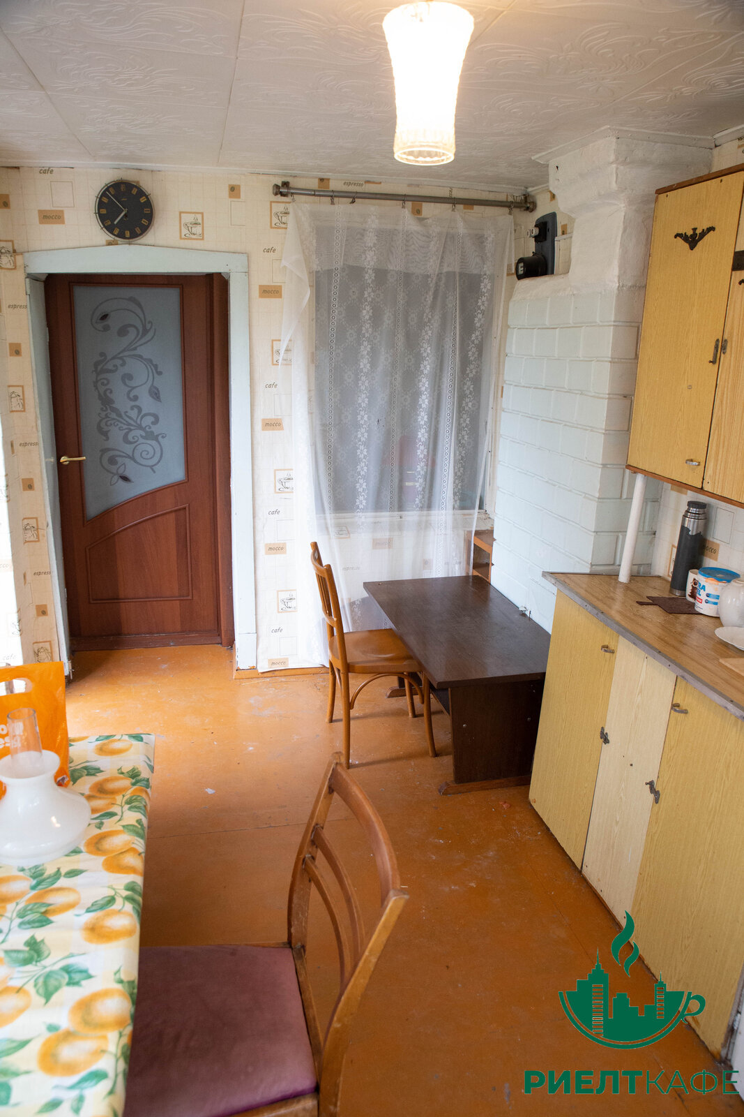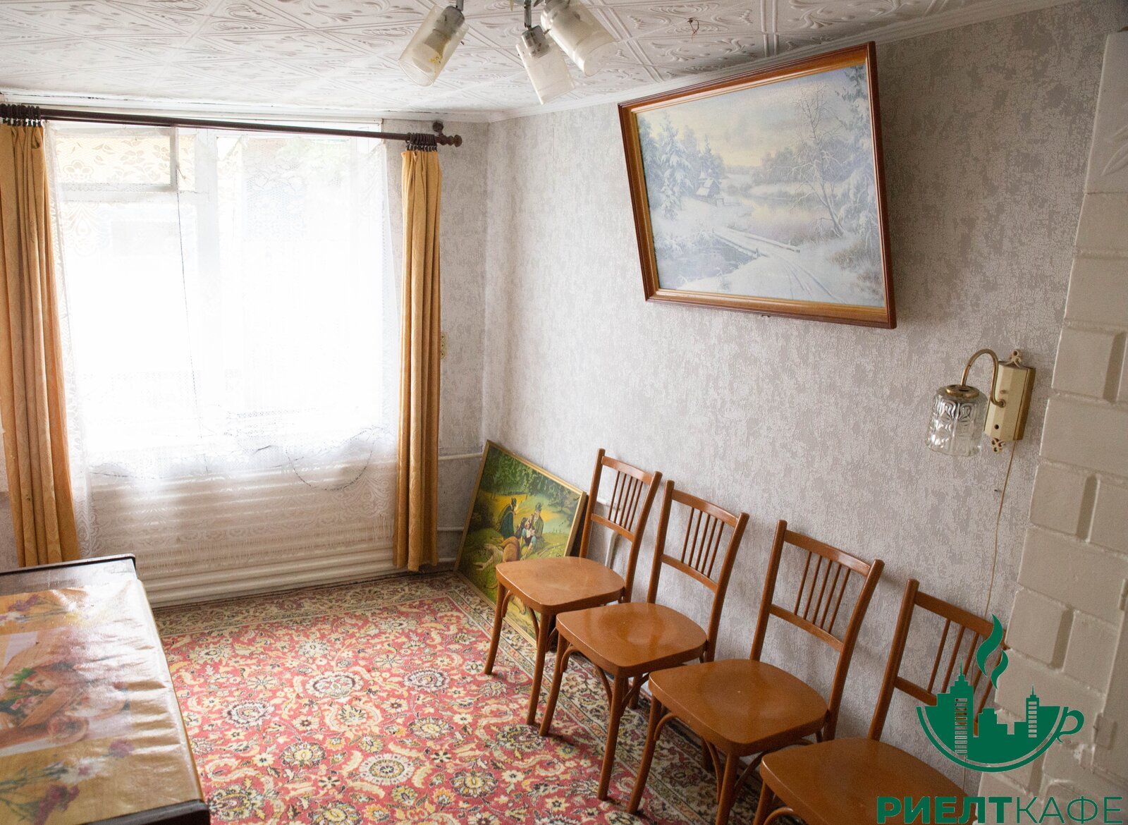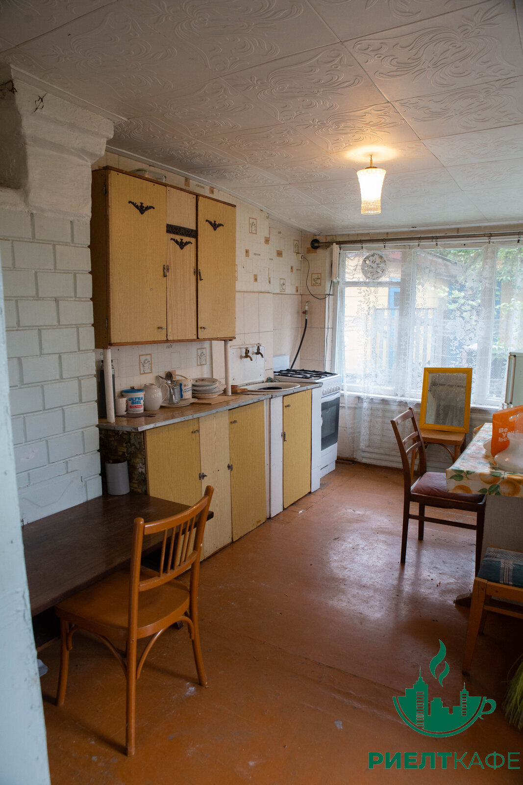 Под ремонт, потолки касетоны, пол частично деревянная доска, частично ДСП, окна -дерево.