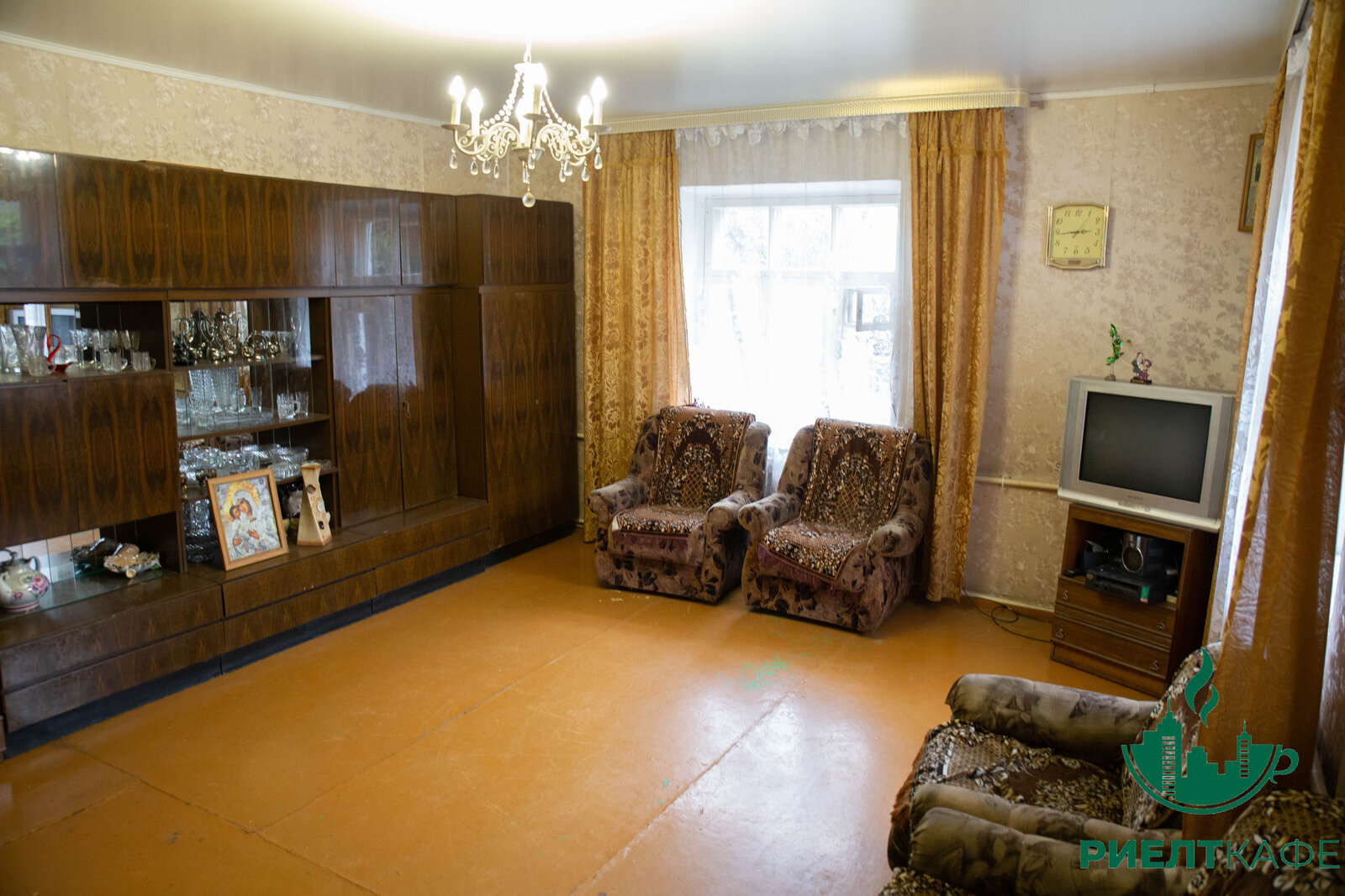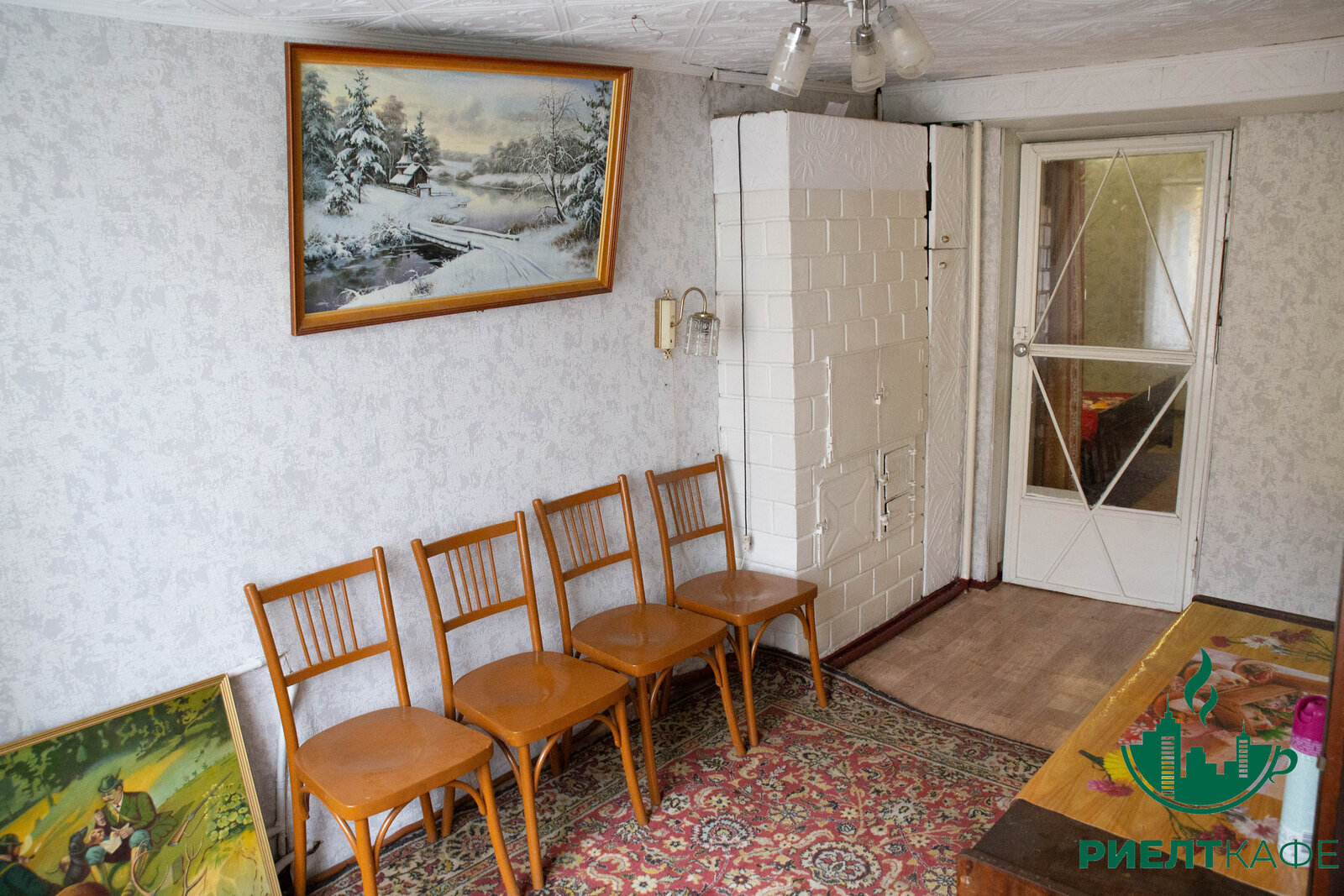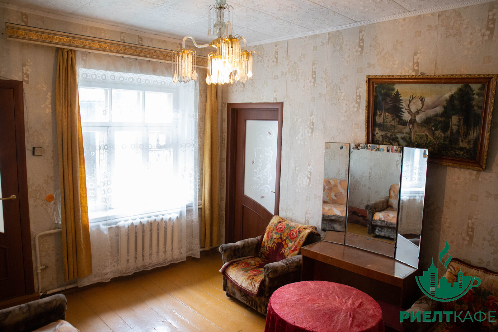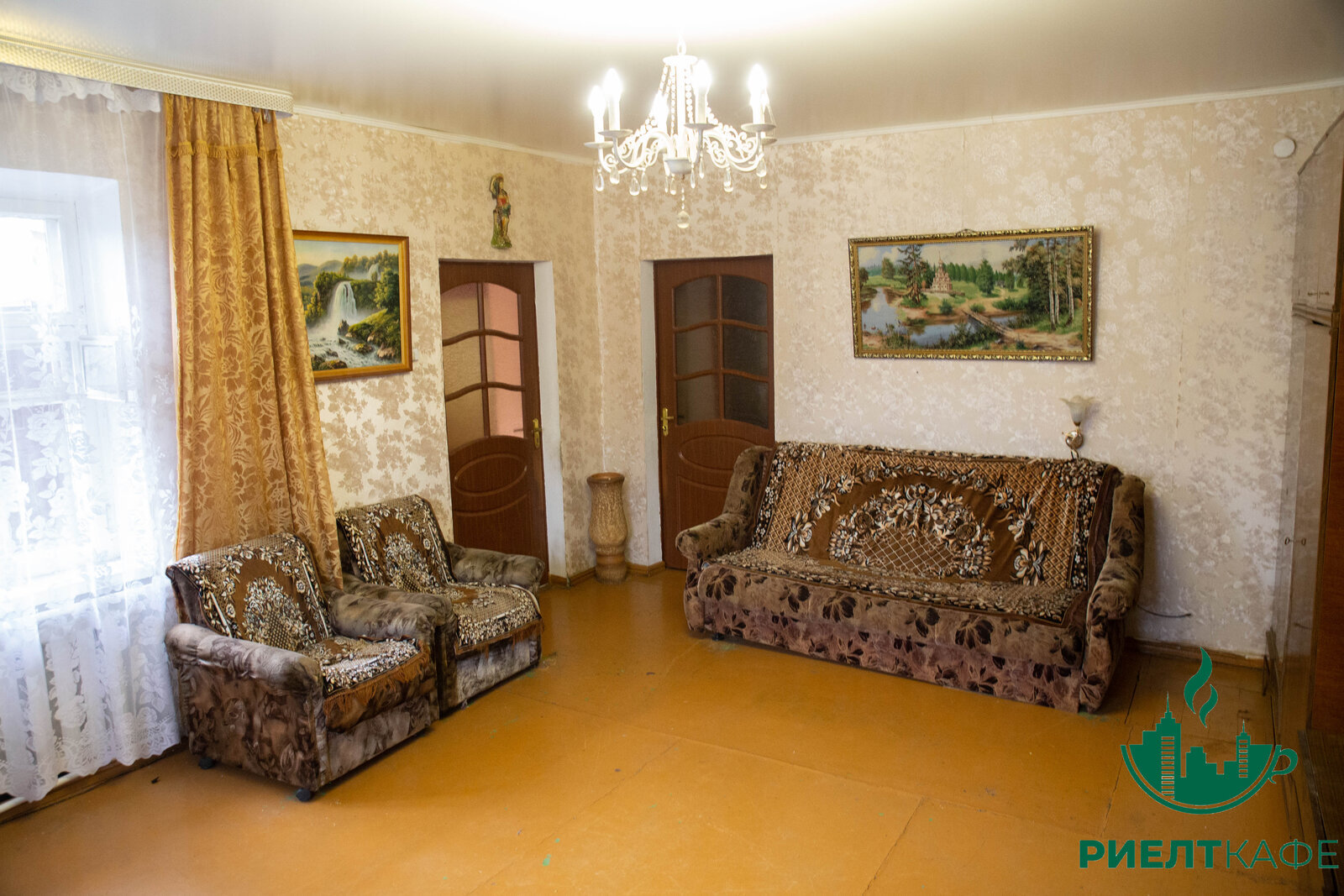 Под ремонт, потолки касетоны, пол частично деревянная доска, частично ДСП, окна -дерево.